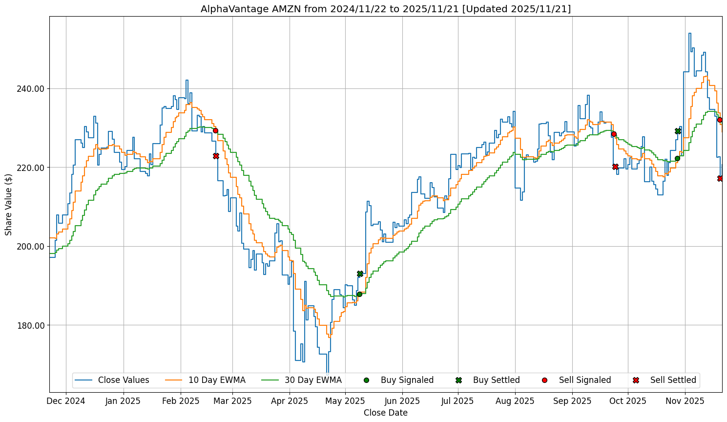 Thank you for using Alpha Vantage! Please consider spreading out your free API requests more sparingly (1 request per second). You may subscribe to any of the premium plans at https://www.alphavantage.co/premium/ to lift the free key rate limit (25 requests per day), raise the per-second burst limit, and instantly unlock all premium endpoints Could not retrieve data from remote server for AMZN.