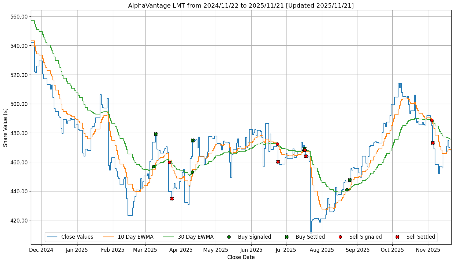 Thank you for using Alpha Vantage! Please consider spreading out your free API requests more sparingly (1 request per second). You may subscribe to any of the premium plans at https://www.alphavantage.co/premium/ to lift the free key rate limit (25 requests per day), raise the per-second burst limit, and instantly unlock all premium endpoints Could not retrieve data from remote server for LMT.