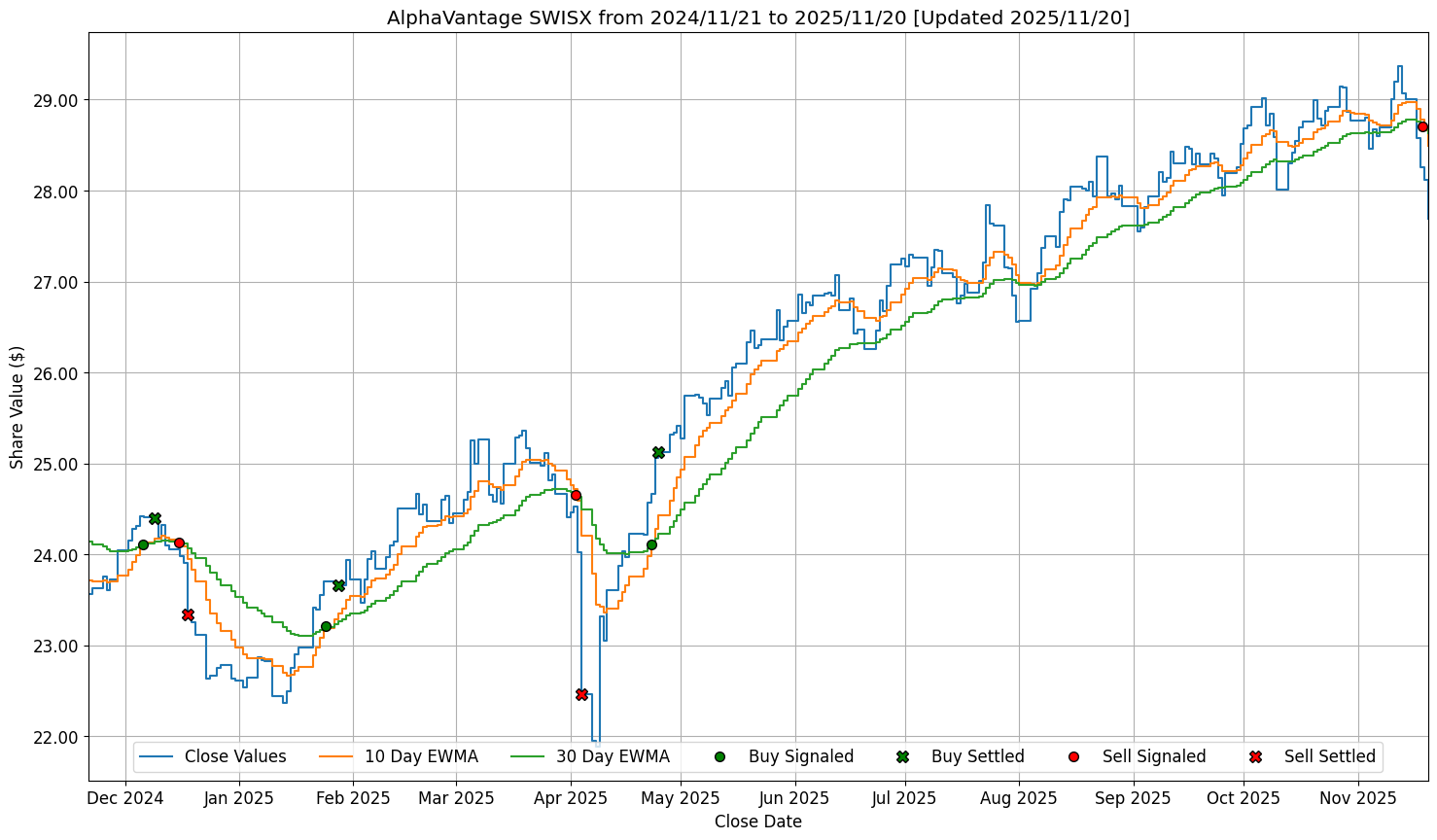Thank you for using Alpha Vantage! Please consider spreading out your free API requests more sparingly (1 request per second). You may subscribe to any of the premium plans at https://www.alphavantage.co/premium/ to lift the free key rate limit (25 requests per day), raise the per-second burst limit, and instantly unlock all premium endpoints Could not retrieve data from remote server for SWISX.