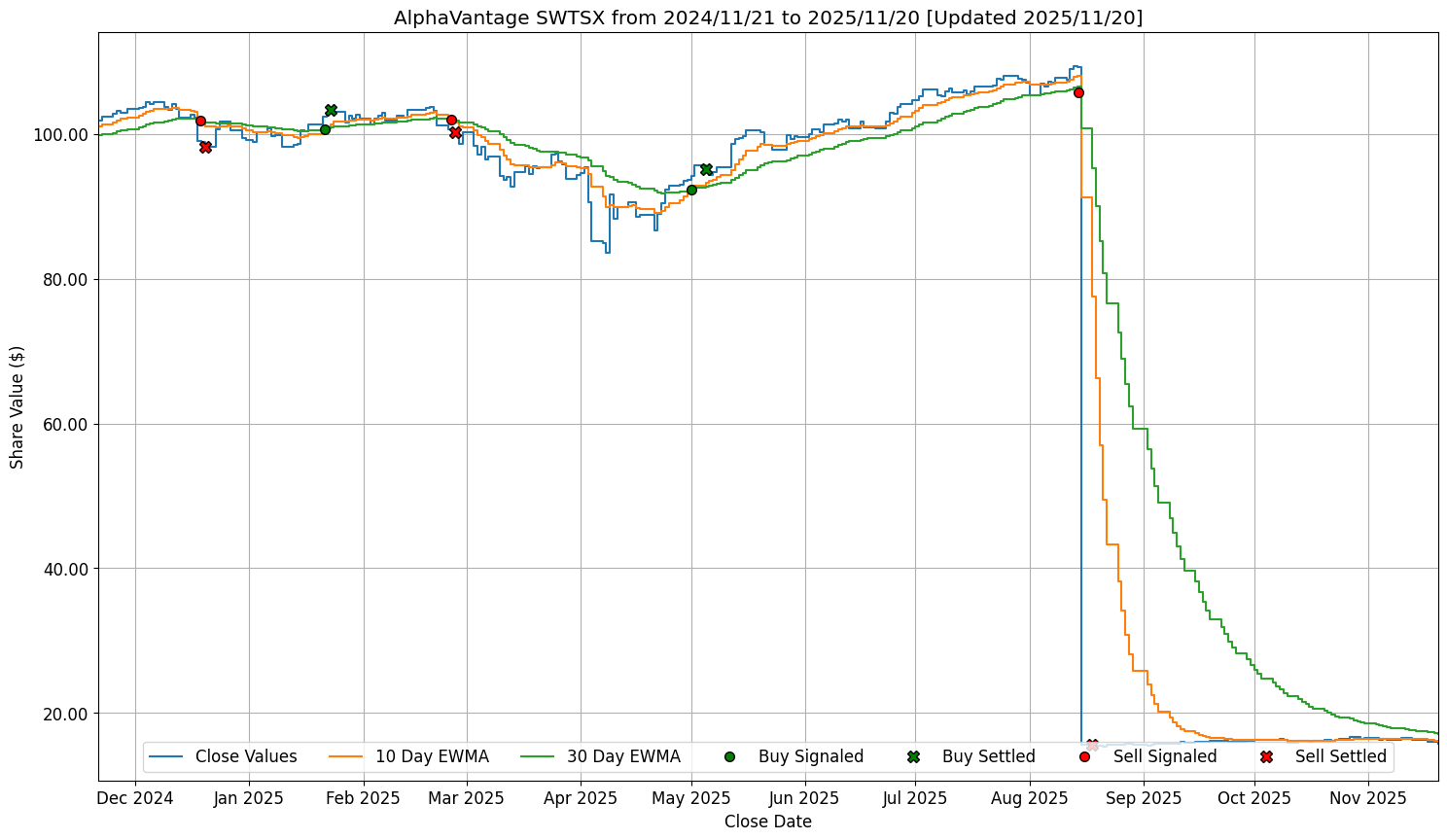 Thank you for using Alpha Vantage! Please consider spreading out your free API requests more sparingly (1 request per second). You may subscribe to any of the premium plans at https://www.alphavantage.co/premium/ to lift the free key rate limit (25 requests per day), raise the per-second burst limit, and instantly unlock all premium endpoints Could not retrieve data from remote server for SWTSX.