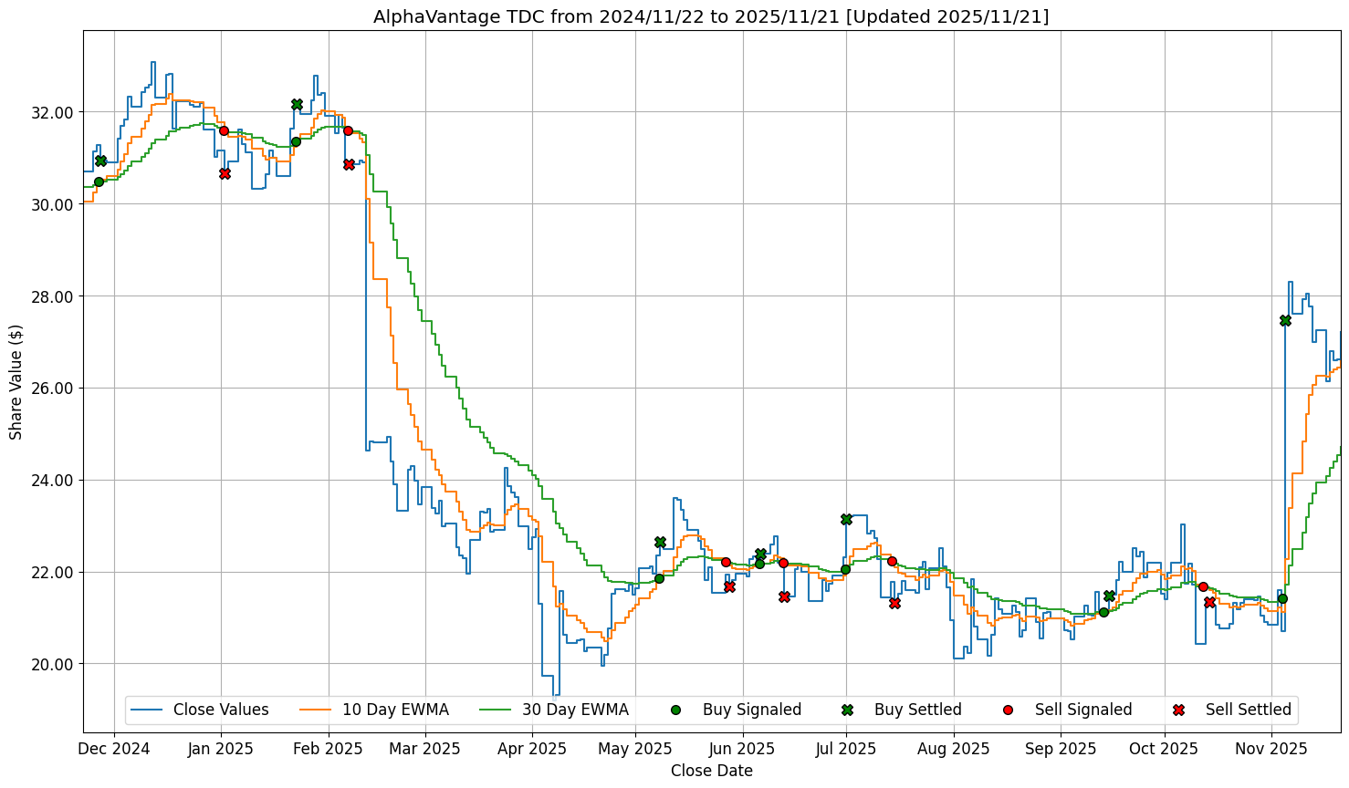 Thank you for using Alpha Vantage! Please consider spreading out your free API requests more sparingly (1 request per second). You may subscribe to any of the premium plans at https://www.alphavantage.co/premium/ to lift the free key rate limit (25 requests per day), raise the per-second burst limit, and instantly unlock all premium endpoints Could not retrieve data from remote server for TDC.