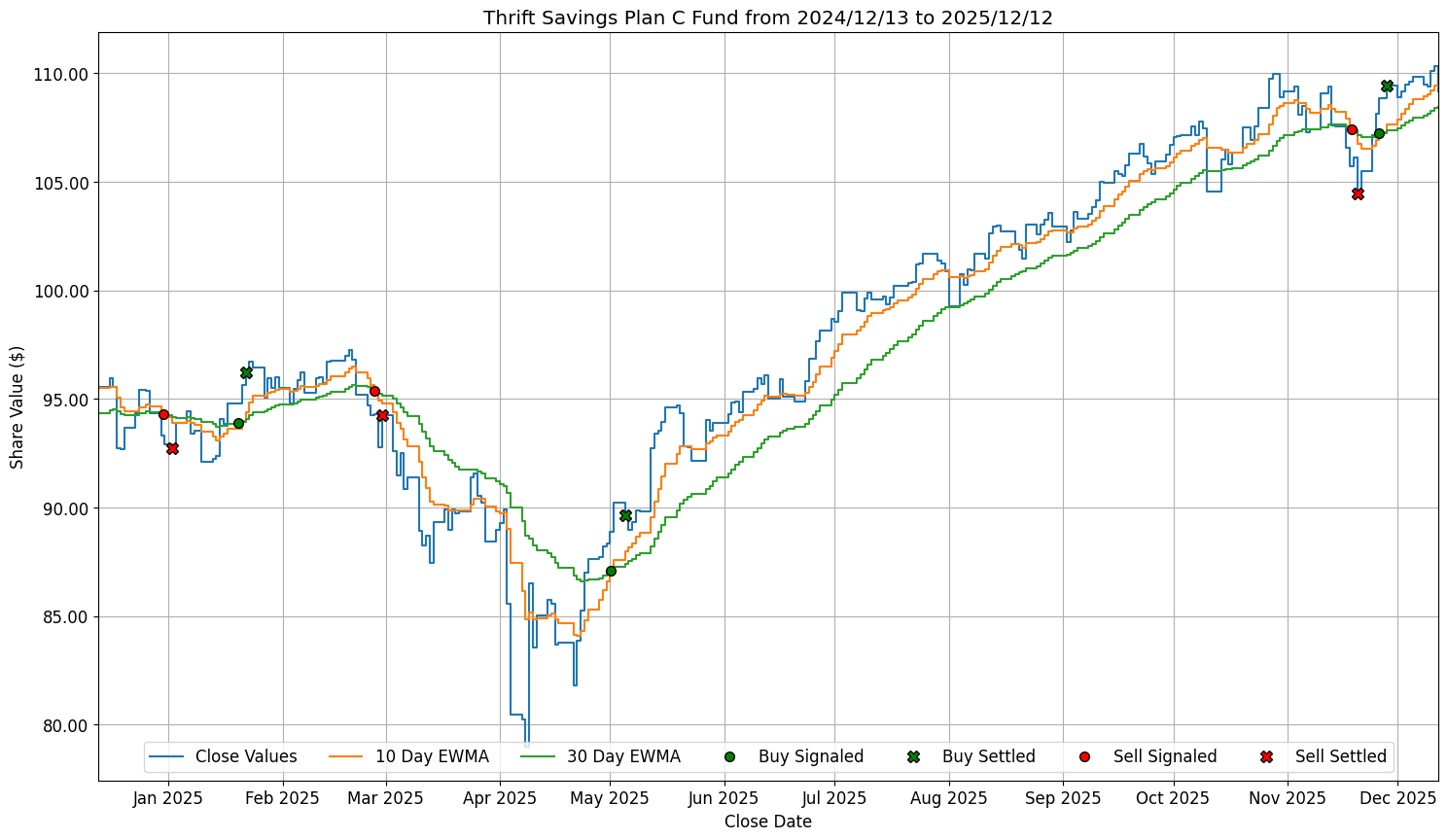 C fund price as of 2025/12/12: $109.17 C fund latest crossover: B 2025/11/26 ( 12|18 days ago) @ $107.23 C fund recent performance: 01 day: $110.34 -$1.17 -1.06% 05 day: $109.83 -$0.67 -0.61% 20 day: $107.58 +$1.58 +1.47% 60 day: $105.35 +$3.81 +3.62% C fund full performance: (assumes 1 day trade delay) Invested: +$13.61 +14.24% Signaled: +$10.52 +11.00% Variance: -$3.09 -3.24%