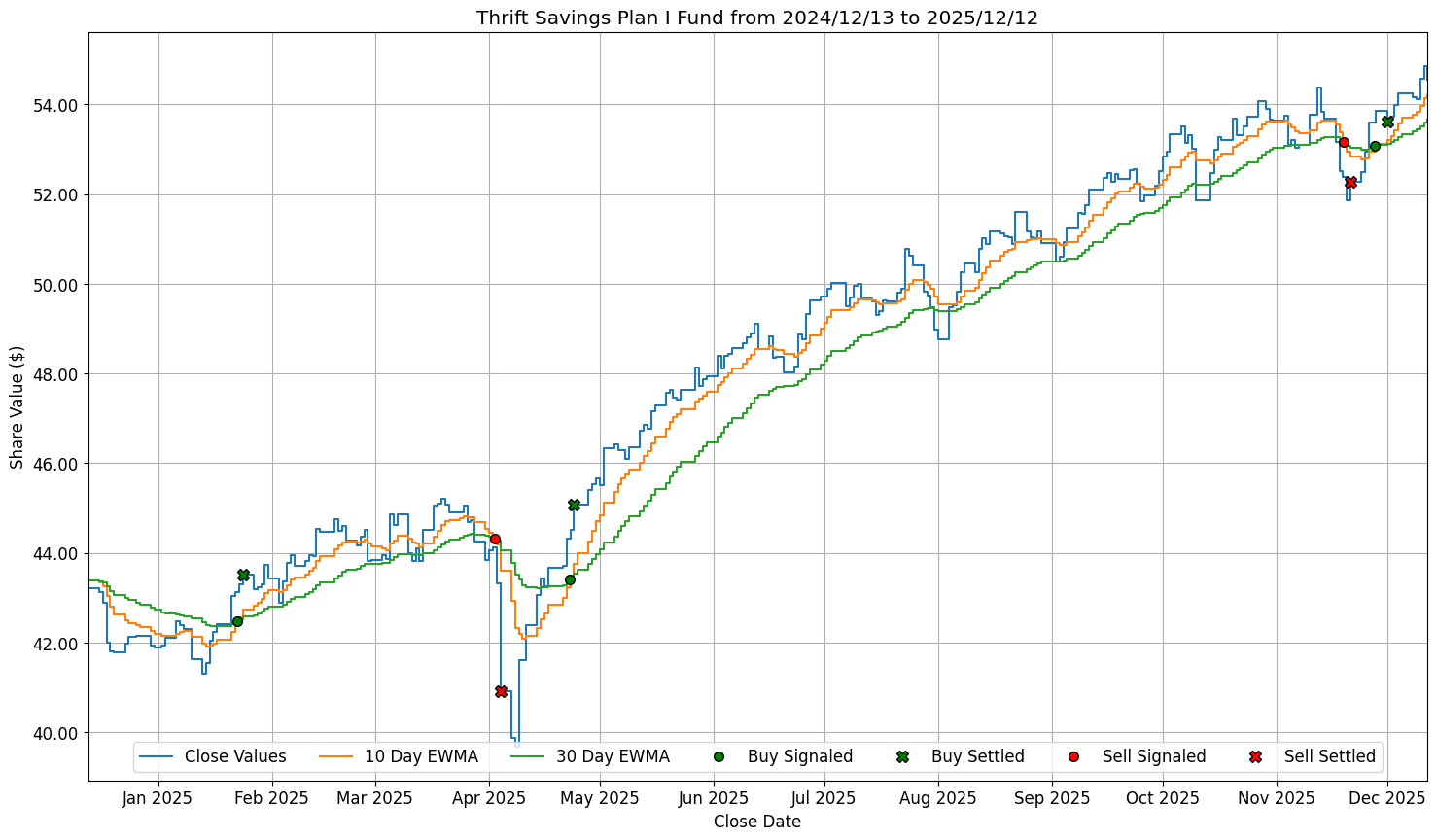 I fund price as of 2025/12/12: $54.54 I fund latest crossover: B 2025/11/28 ( 11|16 days ago) @ $53.08 I fund recent performance: 01 day: $54.86 -$0.32 -0.58% 05 day: $54.24 +$0.30 +0.56% 20 day: $53.83 +$0.71 +1.32% 60 day: $52.48 +$2.06 +3.93% I fund full performance: (assumes 1 day trade delay) Invested: +$11.32 +26.19% Signaled: +$8.14 +18.83% Variance: -$3.18 -7.36%